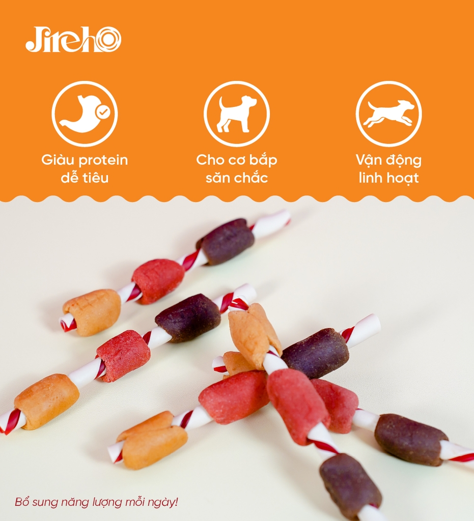 Thịt xiên que JirehO 3 vị: Gà, Vịt, Heo cho chó là snack nhai dành cho chó với công thức kết hợp ba nguồn đạm dinh dưỡng, mang đến hương vị đậm đà tự nhiên và trải nghiệm nhai thú vị mỗi ngày. Sản phẩm phù hợp dùng làm phần thưởng bổ sung hằng ngày, giúp boss nhai vui, nạp thêm năng lượng và duy trì thể trạng ổn định.