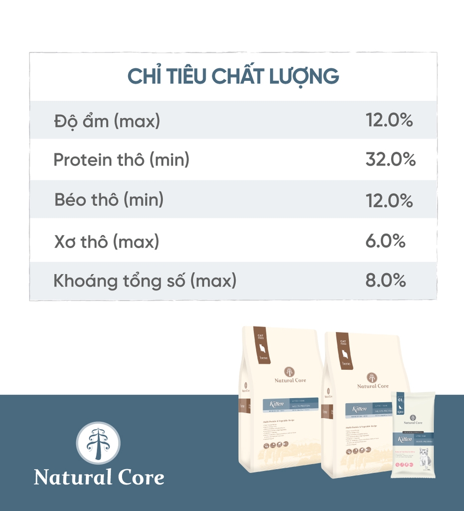 Sản phẩm cung cấp nguồn protein tự nhiên từ thịt gà và cá hồi, giúp mèo con phát triển cơ bắp, tăng trưởng khỏe mạnh và năng động trong giai đoạn phát triển quan trọng.