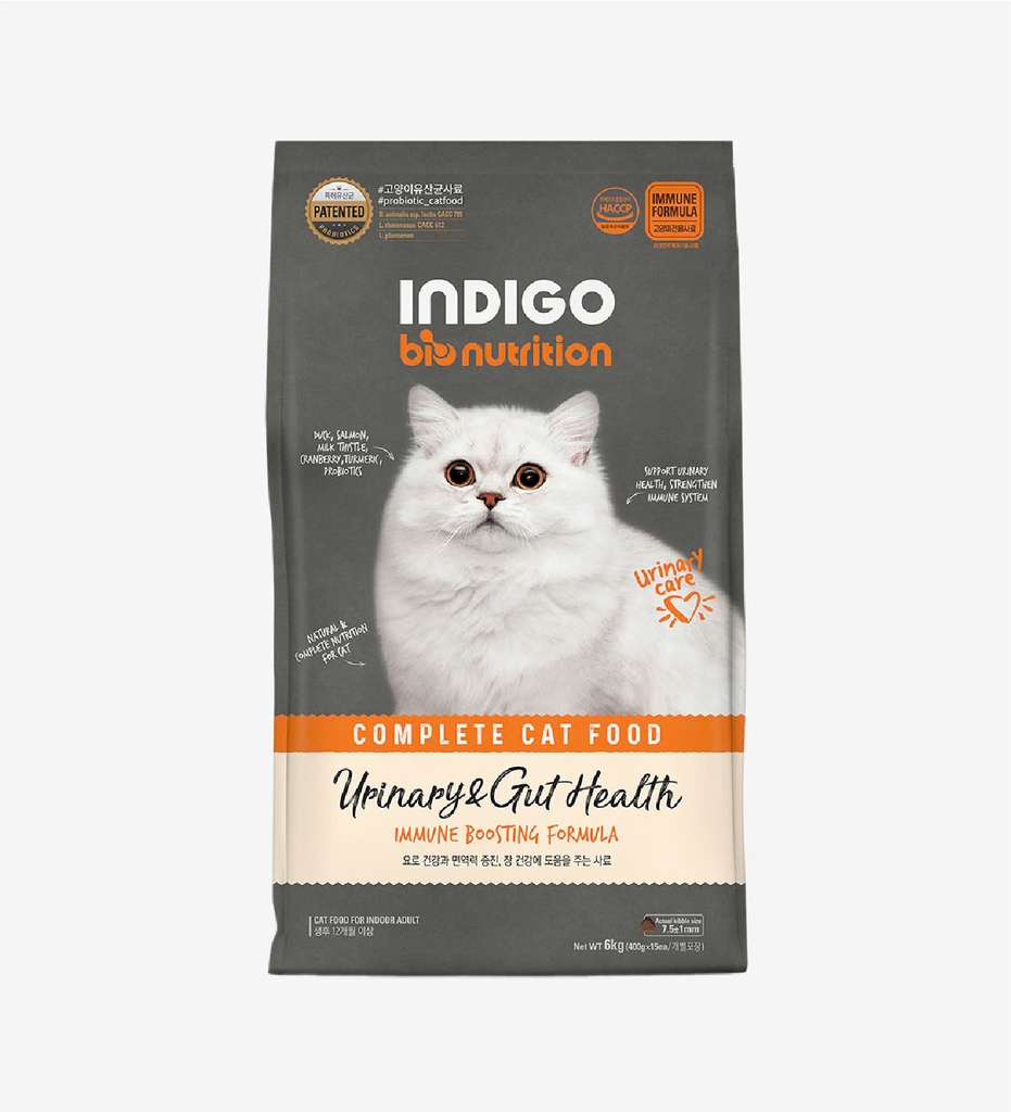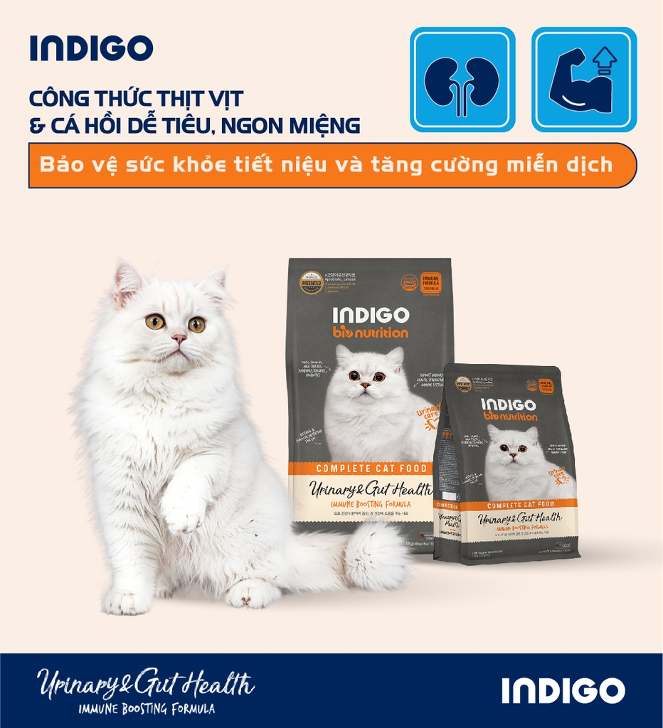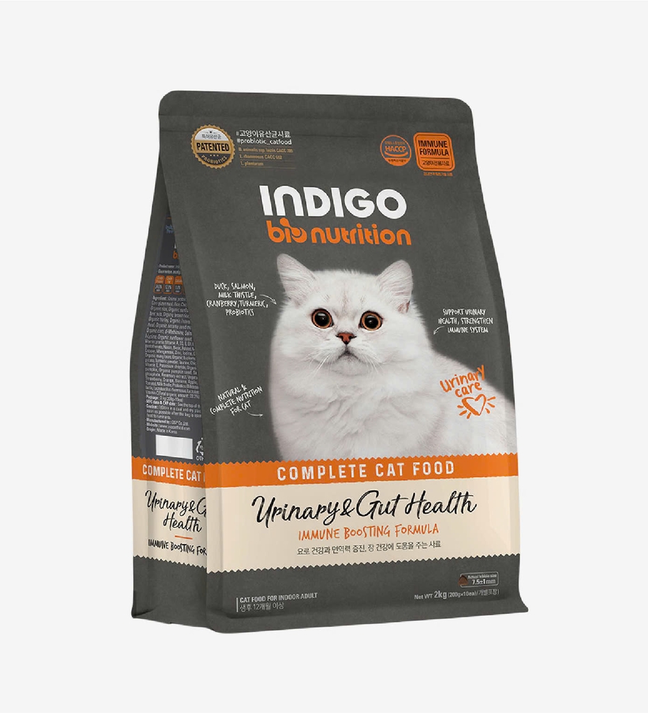 INDIGO là thương hiệu đầu tiên tại Hàn Quốc phát triển thức ăn dinh dưỡng chức năng cho mèo chứa lợi khuẩn được cấp bằng sáng chế. Thức ăn dinh dưỡng chức năng cho mèo tăng cường sức khỏe tiết niệu và tiêu hóa ứng dụng công nghệ men vi sinh độc quyền giúp cân bằng hệ vi sinh đường ruột, giảm rối loạn tiêu hóa và tối ưu hấp thu đạm, vitamin và khoáng chất, từ đó tăng sức đề kháng tự nhiên.