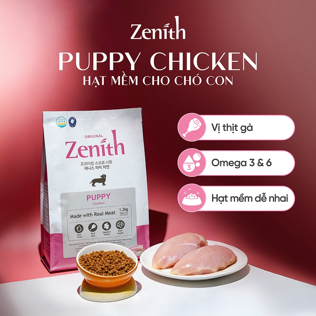 Zenith Original Puppy Chicken được phát triển dành riêng cho chó con trong giai đoạn tăng trưởng, với nguồn đạm từ thịt gà, công thức dễ tiêu và hạt mềm giúp chó con làm quen thức ăn khô, hỗ trợ phát triển toàn diện ngay từ những năm đầu đời.