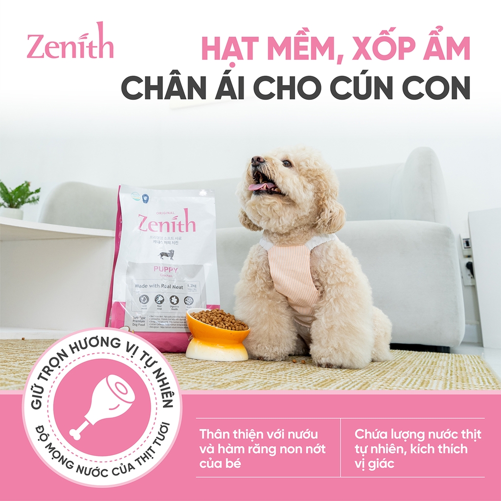 Zenith Puppy Chicken sở hữu kết cấu hạt mềm xốp ẩm, được thiết kế phù hợp với hàm răng và nướu còn non của cún con trong giai đoạn phát triển. Độ mềm tự nhiên cùng hàm lượng nước thịt phong phú giúp bé nhai dễ hơn, tiêu hoá nhẹ nhàng hơn và cảm nhận bữa ăn ngon miệng hơn mỗi ngày. Đây cũng là lựa chọn phù hợp cho những bé kén ăn hoặc chưa quen với hạt khô cứng, giúp mỗi bữa ăn trở nên dễ chịu và hào hứng hơn.